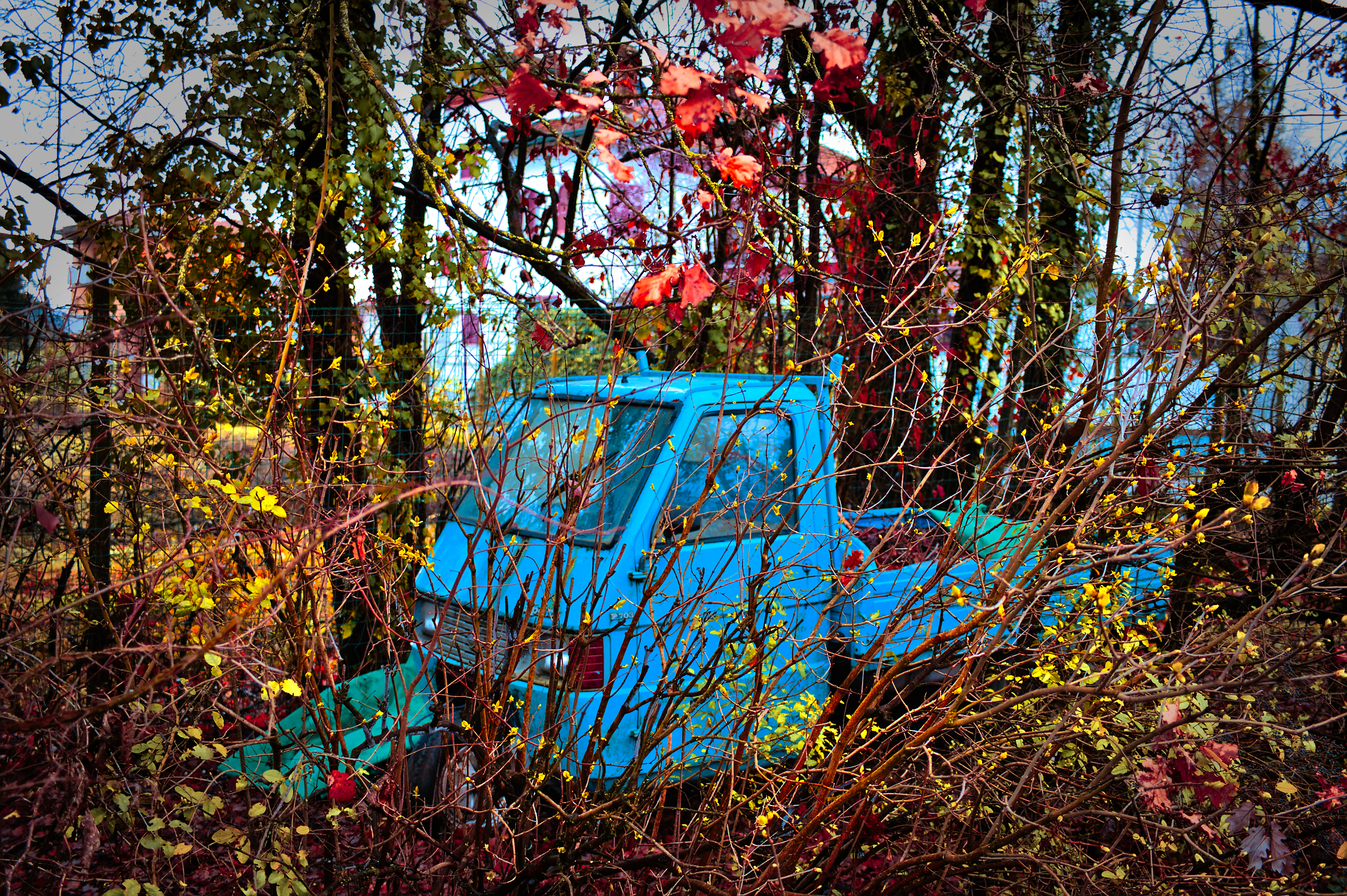 The Blue Truck in Autumn is a captivating photograph that showcases the artist's skillful use of light and color to evoke a sense of nostalgia and wonder. The image features an old blue truck nestled among autumnal foliage, its vibrant hues standing out against the muted tones of the surrounding leaves. The artist has employed a range of techniques to achieve this effect, including the use of warm lighting to accentuate the colors of the truck and the leaves, as well as the strategic placement of shadows to add depth and dimension to the image. The result is a visually stunning photograph that invites the viewer to step into a world of beauty and tranquility.